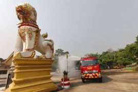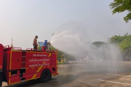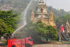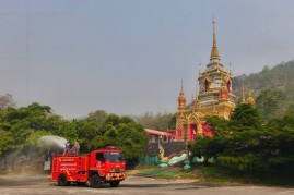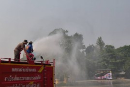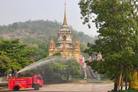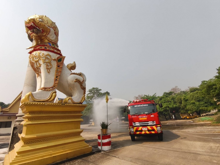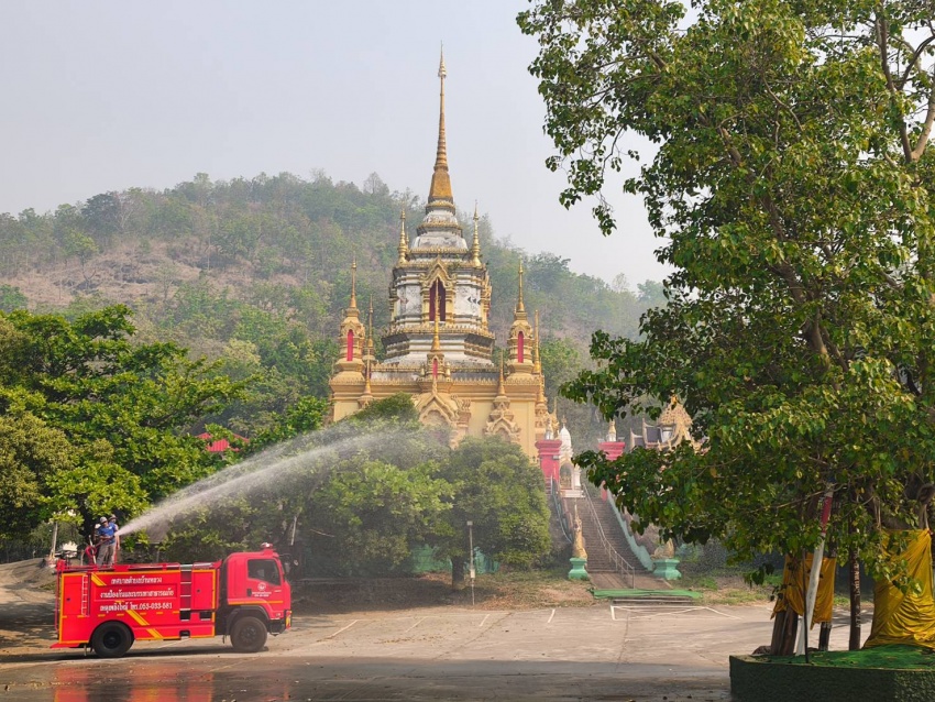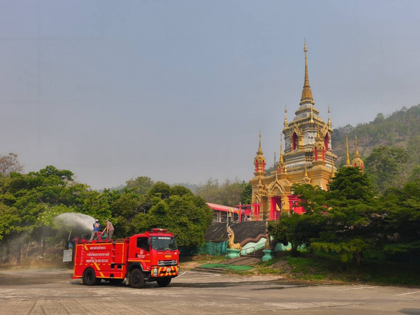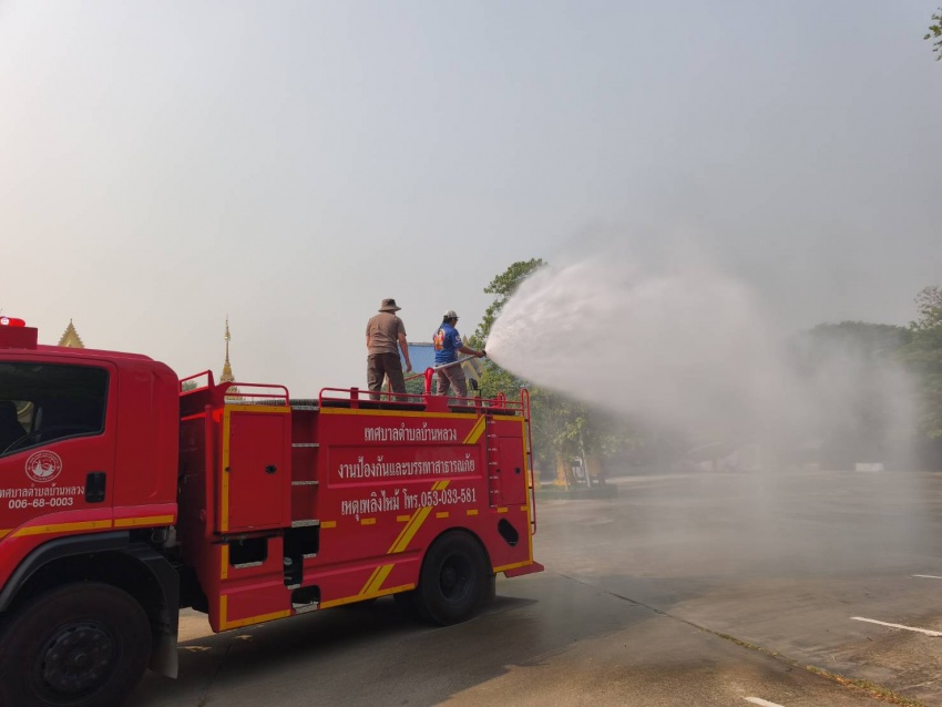 งานป้องกันและบรรเทาสาธารณภัย สำนักปลัดเทศบาลตำบลบ้านหลวง นำรถบรรทุกน้ำออกปฏิบัติงานฉีดพ่นน้ำ ณ วัดน้ำตกแม่กลาง