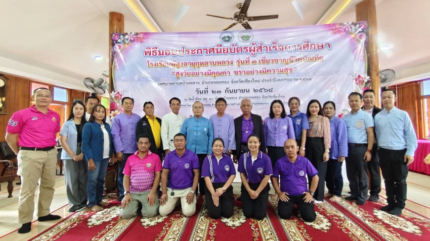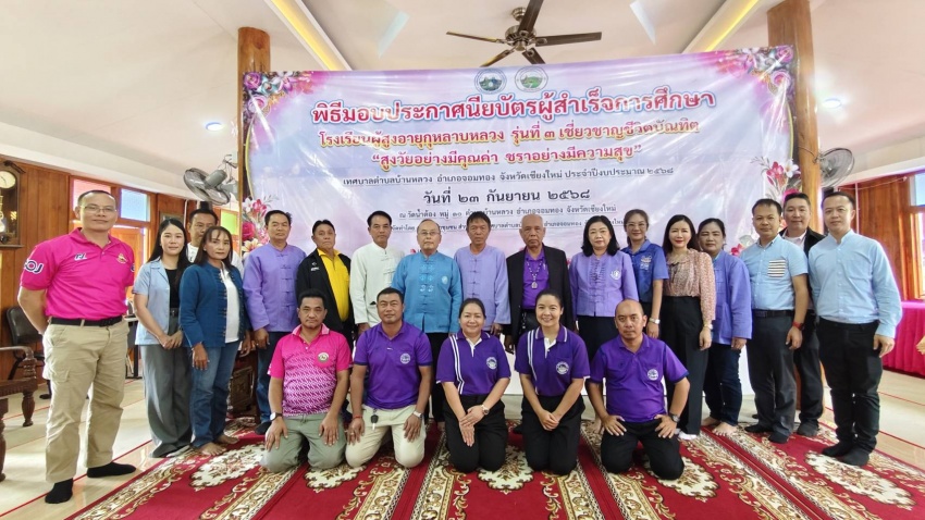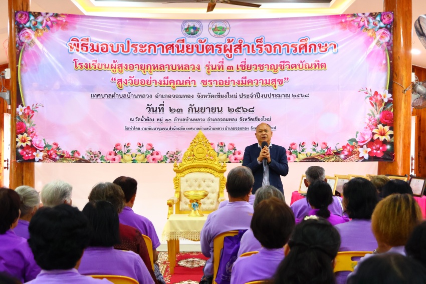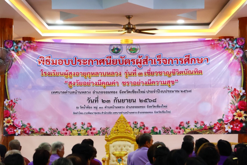 เทศบาลตำบลบ้านหลวง ดำเนินการจัดโครงการส่งเสริมกิจกรรมศูนย์พัฒนาและฟื้นฟูคุณภาพชีวิตผู้สูงอายุและคนพิการ กิจกรรมมอบวุฒิบัตร โรงเรียนผู้สูงอายุกุหลาบหลวง รุ่นที่ 3 จำนวน 136 คน โดยมีนายก่อชิ เพชรไพรพนาวัลย์ (นายกเทศมนตรีตำบลบ้านหลวง) ประธานโครงการฯ พร้อมด้วย คณะผู้บริหารเทศบาลตำบลบ้านหลวง / สมาชิกสภาเทศบาล / ผู้อำนวยการรพ.สต.เเม่หอย /ผู้อำนวยการรพ.สต.ห้วยเฮี๊ยะ / กสร.ตำบลบ้านหลวง / ผู้นำชุมชน ตลอดจนพนักงานเจ้าหน้าที่เทศบาลเข้าร่วมกิจกรรมในครั้งนี้ เเละได้รับเมตตาจาก ท่านพระครูรัตนบุญโญภาส เจ้าอาวาสวัดน้ำต้อง