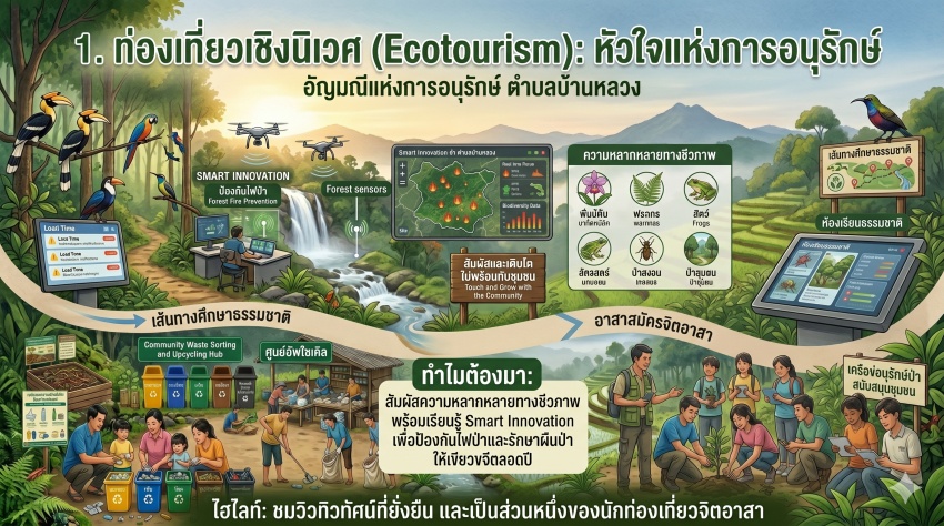 ทำไมต้องมา: คุณจะได้เดินเส้นทางศึกษาธรรมชาติที่ได้รับการฟื้นฟู สัมผัสความหลากหลายทางชีวภาพทั้งพรรณไม้และสัตว์ป่า พร้อมเรียนรู้ระบบ "Smart Innovation" ที่ชุมชนใช้เพื่อป้องกันไฟป่าและรักษาผืนป่าให้เขียวขจีตลอดปี