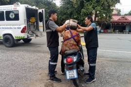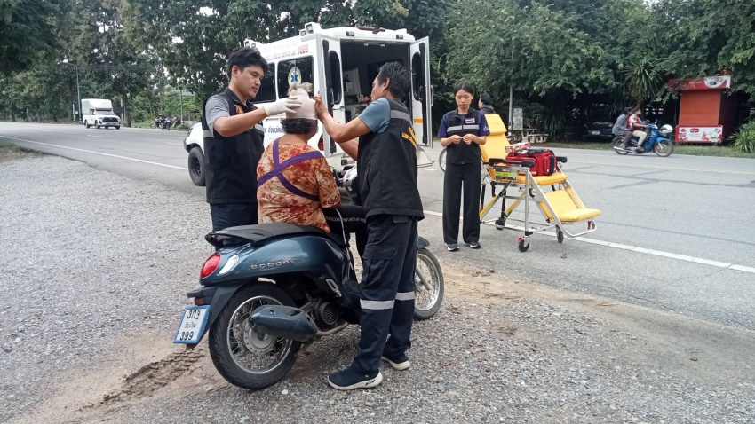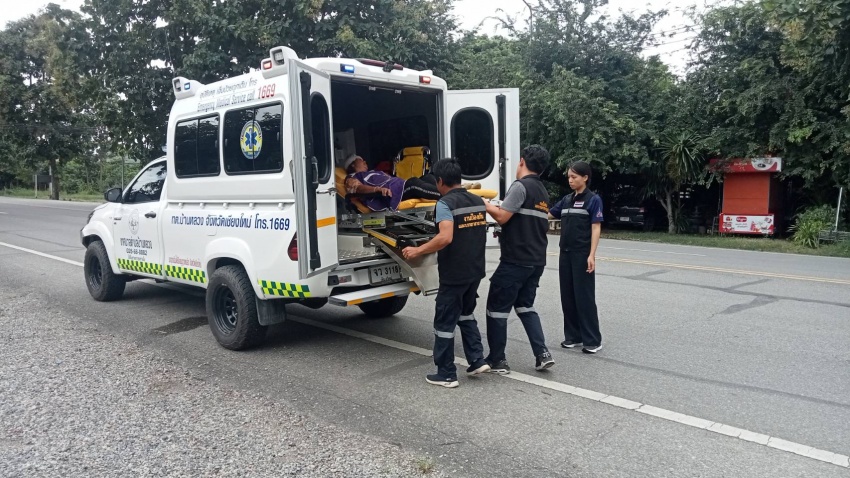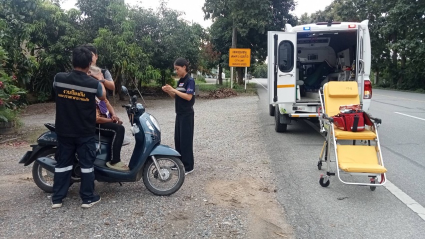 งานกู้ชีพ เทศบาลตำบลบ้านหลวง ได้รับแจ้งจากศูนย์กู้ชีพ รพ.จอมทอง ขอให้จัดรถรับผู้ป่วยเหตุรถจักรยานยนต์แฉลบล้มเอง บริเวณหน้าหอพักสองพี่น้องใกล้แยกโรงแรมราชพฤกษ์ ม.14 ต.ข่วงเปา หลังได้รับแจ้งได้จัดรถพร้อมมเจ้าหน้าที่ออกทำการช่วยเหลือผู้ป่วย ที่เกิดเหตุพบหญิง อายุ 51 ปี มีอาการซึม อ่อนแรง พบแผลเปิดบริเวณศรีษะ ได้ทำการช่วยเหลือ พร้อมนำตัวส่งรักษาต่อที่ รพ.จอมทองในเวลาต่อมา