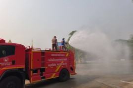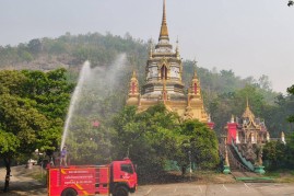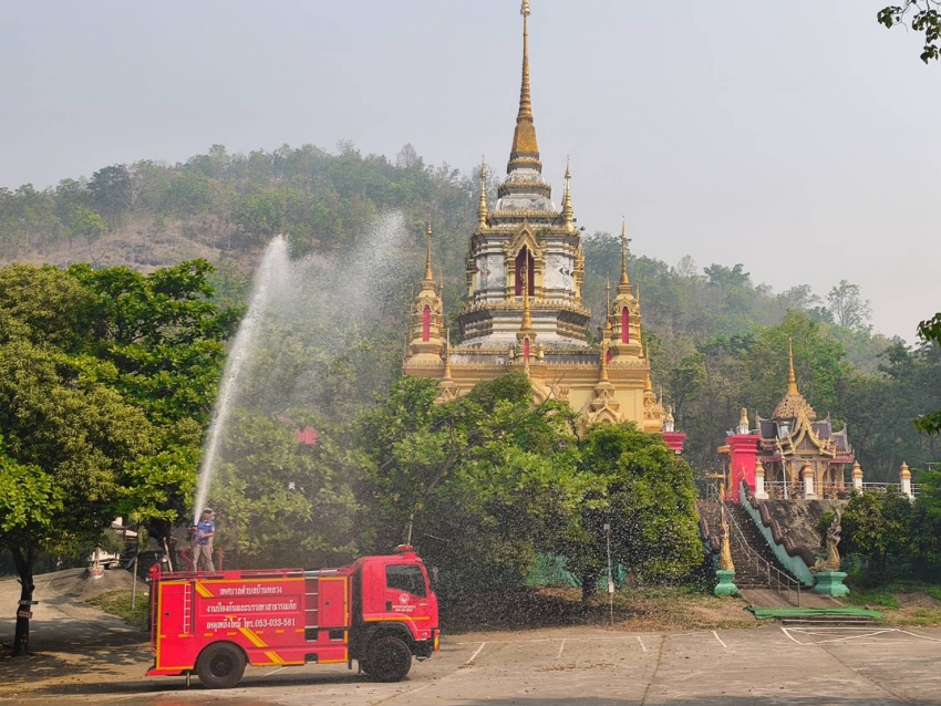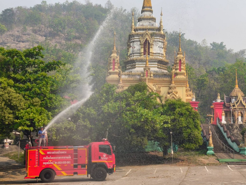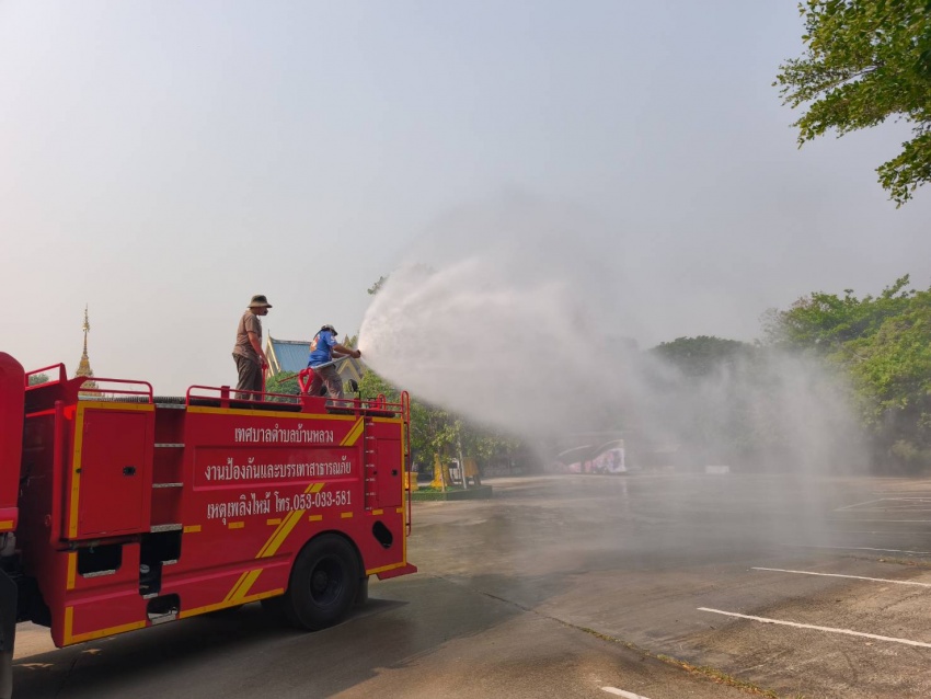 งานป้องกันและบรรเทาสาธารณภัย สำนักปลัดเทศบาลตำบลบ้านหลวง นำรถบรรทุกน้ำออกปฏิบัติงานฉีดพ่นน้ำ ณ วัดน้ำตกแม่กลาง