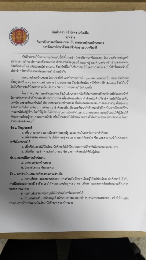 บันทึกความเข้าใจความร่วมมือระหว่างวิทยาลัยการอาชีพจอมทอง ในการพัฒนาการจัดการอาชีวศึกษา
